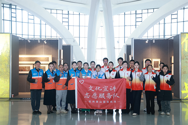 本次志愿讲解队伍的核心力量,由杭州机场与浙江大学出版社党员党员组成;此外,团队中还汇聚了高校艺术专业师生、熟悉国际交流的企业党员、资深志愿者及一线机场职工等多元力量。尽管大家来自不同领域、岗位各异,但投身中华优秀传统文化传播的热情始终如一,如冬日暖阳般温暖着每一位往来旅客。“能在旅客抵达杭州的第一站,为他们推开一扇了解中国绘画的窗,哪怕只是短暂驻足,也是一份真诚的‘文化见面礼’。”拥有28年志愿服务经历的党员马翔,道出了所有志愿者的共同心声。