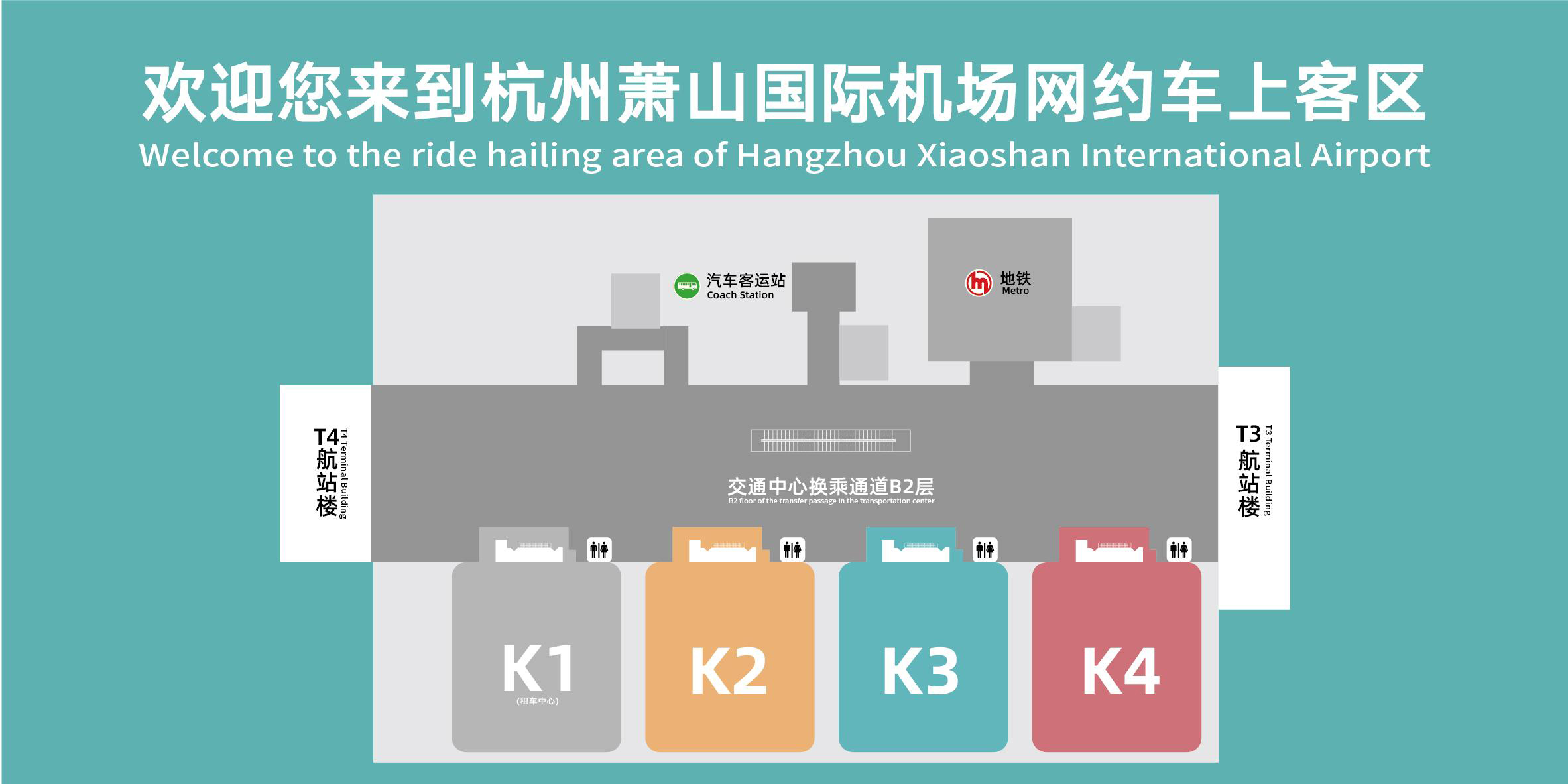 杭州萧山国际机场共有3处网约车专用上客区,分别位于交通中心B2层2号、3号和4号电梯厅内;
