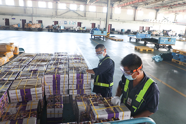 “以前的货物普货多,操作相对简单些,现在货物品种多,海鲜、水果、苗鸡苗鸭这些多,分拣起来更耗时间,要求分拣速度更快。”装卸队长程富忠是老货运人,对分拣处理货物有自己的经验,“我们也是不断地在学,不然跟不上要求,现在有信用客户,他们的货我们会优先分拣,海鲜水果这些也优先分拣,现在小狗小猫运来的也多,还有专门的贵宾室放,条件很好。”正说着程富忠将一个拖斗拉到仓库南面的一个区域,熟练地解开货物拖斗上的网罩,麻利地分拣起货物来。原来这是来自新疆乌鲁木齐,由于零星疫情出现,物流公司对涉疫地区进港货物实现“专门登记、隔离分拣、提货信息登记”的措施,确保货物运输处理可溯源。