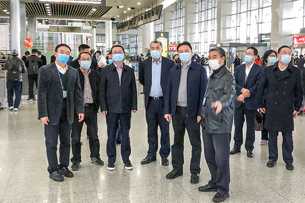 (图为郑向平一行实地参观贵阳机场高铁站)