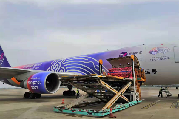 3月29日19:11,载有45.8吨货物的YG9033航班从杭州机场起飞前往新加坡,这是菜鸟首次租用圆通767型全货机在杭执行国际货运航班。