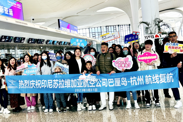 "nbsp;"nbsp;"nbsp;"nbsp;3月31日17:54,SJ1185航班搭载184名旅客从杭州机场起飞前往印尼巴厘岛,标志着杭州机场巴厘岛航线时隔三年复航。该航线由苏拉维加亚航空采用737-800机型执飞,每周往返一班。