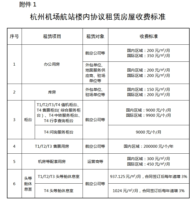 房屋(场地)协议租赁收费标准包含航站楼内和航站楼外两部分,具体收费标准详见附件1和附件2。房屋(场地)协议租赁项目应严格按收费标准执行。