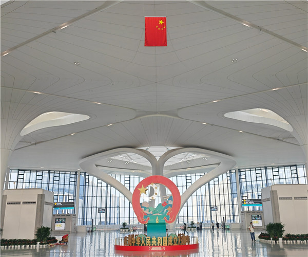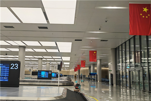 在国庆前夕刚投入运营的新航站楼(T4)出发大厅,鲜艳的国旗高高悬挂,引来旅客驻足瞻仰,别致国庆主题布置成为旅客纷纷打卡合影的景点。在值机岛、安检通道、行李转盘,五星国旗随处可见,整个航站楼洋溢着喜庆、热烈的节日氛围。
