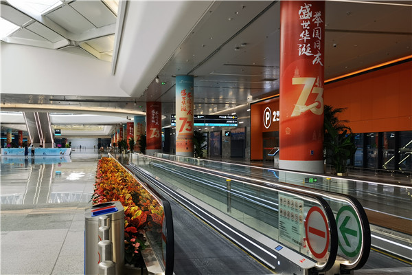 在交通中心换乘通道,一个个节庆主题包柱营造出庄重热烈的国庆节日氛围。在空港大道、巴士车站等区域,一面面鲜艳的五星红旗整齐悬挂,迎风招展,燃起出行旅客浓浓的爱国情意。(刘建豪郑志奕蔡路通)