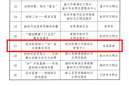 近日,浙江省委宣传部(省文明办)公布了2025年全省新时代文明实践推广项目名单。航站区管理中心推送的杭州机场初心“站”放志愿服务项目成功入选,成为省属企业中唯一获此殊荣的推广项目。
